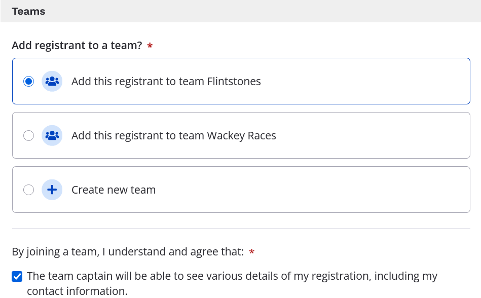 • Team creation is located at the bottom of the registration page.
